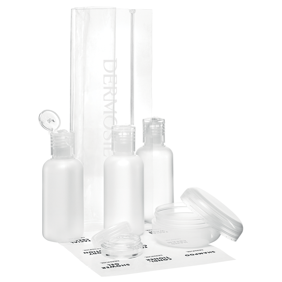 I setet finns tre tomma flaskor på 60 ml med flipkork samt två reseförpackningar med skruvkork. Den större reseförpackningen med skruvkork rymmer 35 ml och lämpar sig till exempel för body lotion. Den mindre rymmer 5 ml och lämpar sig till exempel för ansiktskräm eller för förvaring av piller. Till setet hör dessutom en återförslutningsbar plastpåse vars mått är ca 21 x 21 cm. Påsens mått är anpassade enligt kraven för en påse med kosmetikinnehåll som får tas med i handbagaget på flyget.