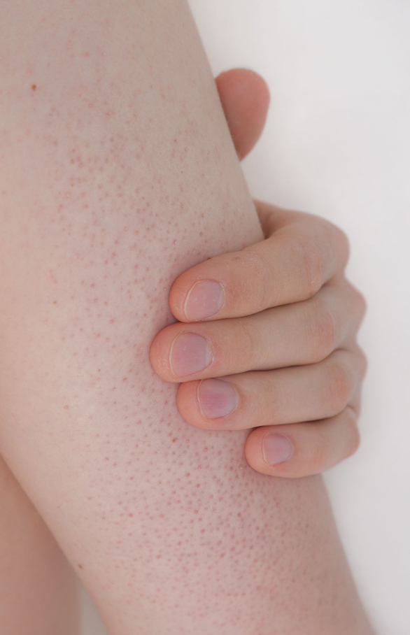 Kroppssprayen är lämplig att använda på hud med keratosis pilaris, även kallad "jordgubbshud".