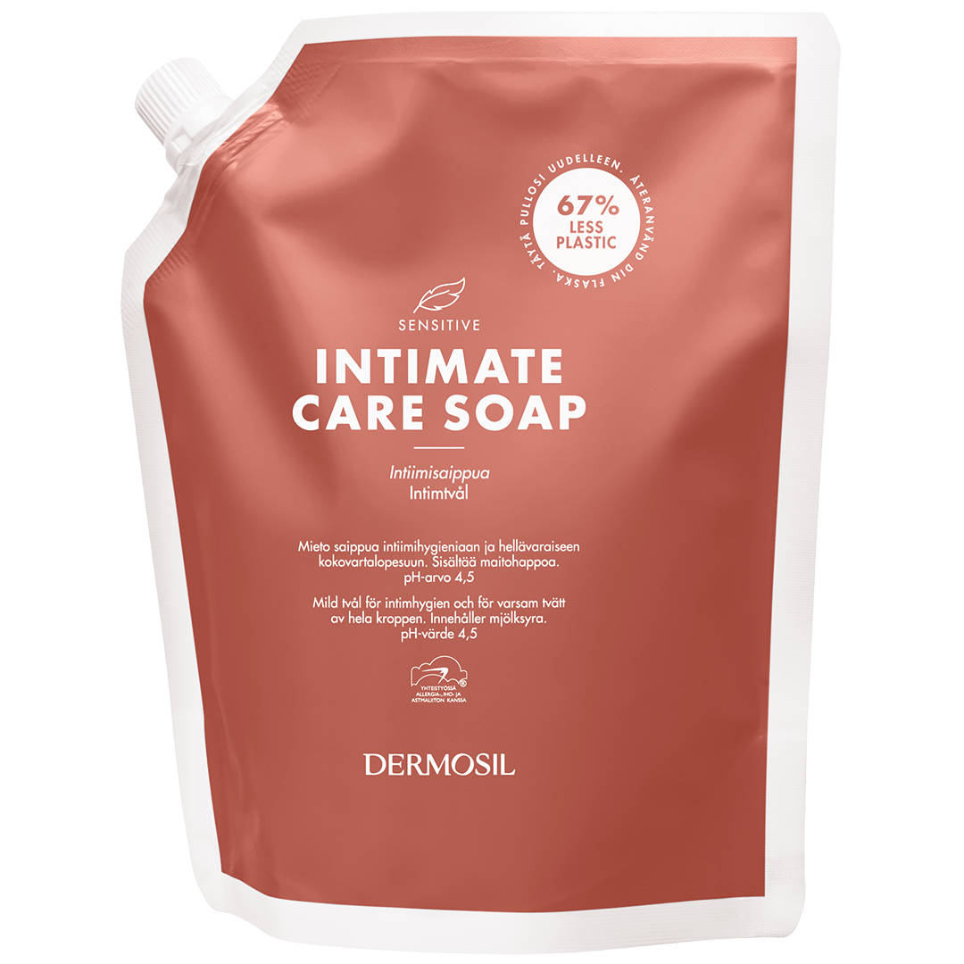 Sensitive Intimtvål innehåller mjölksyra och har ett lågt pH-värde, 4,5. Det låga pH-värdet gör tvålen perfekt för intimtvätt. Intimtvålen löddrar svagt och har en positiv återfuktande effekt på huden.