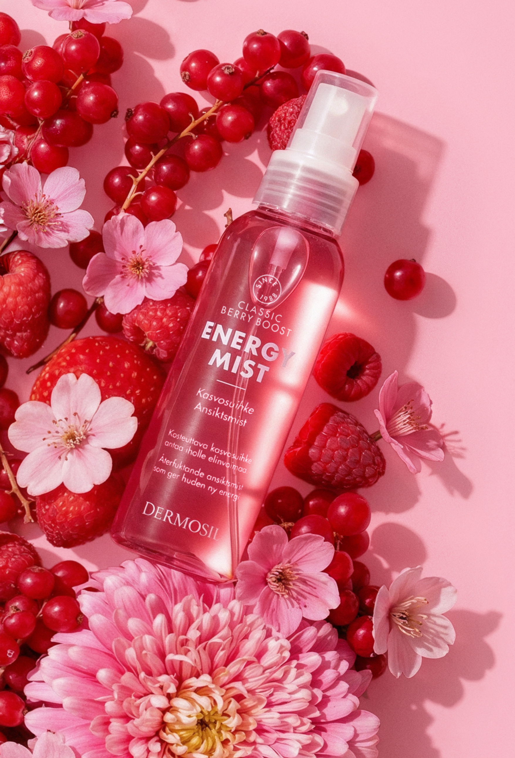 Berry Boost Ansiktsmist är en återfuktande ansiktsmist som piggar upp och ger huden ny energi och vitalitet. Efter en dos ansiktsmist känns huden fräsch och får härlig glow och lyster.