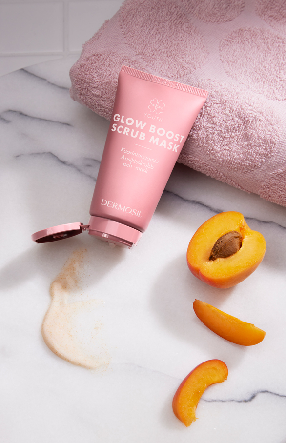 En effektiv men skonsam ansiktsskrubb som innehåller både mekaniska exfolierande partiklar och exfolierande syror. Masken gör huden underbart slät och mjuk och ger ansiktet lyster. Peelingmasken har samma milda och söta aprikosdoft som andra produkter i Youth-serien.