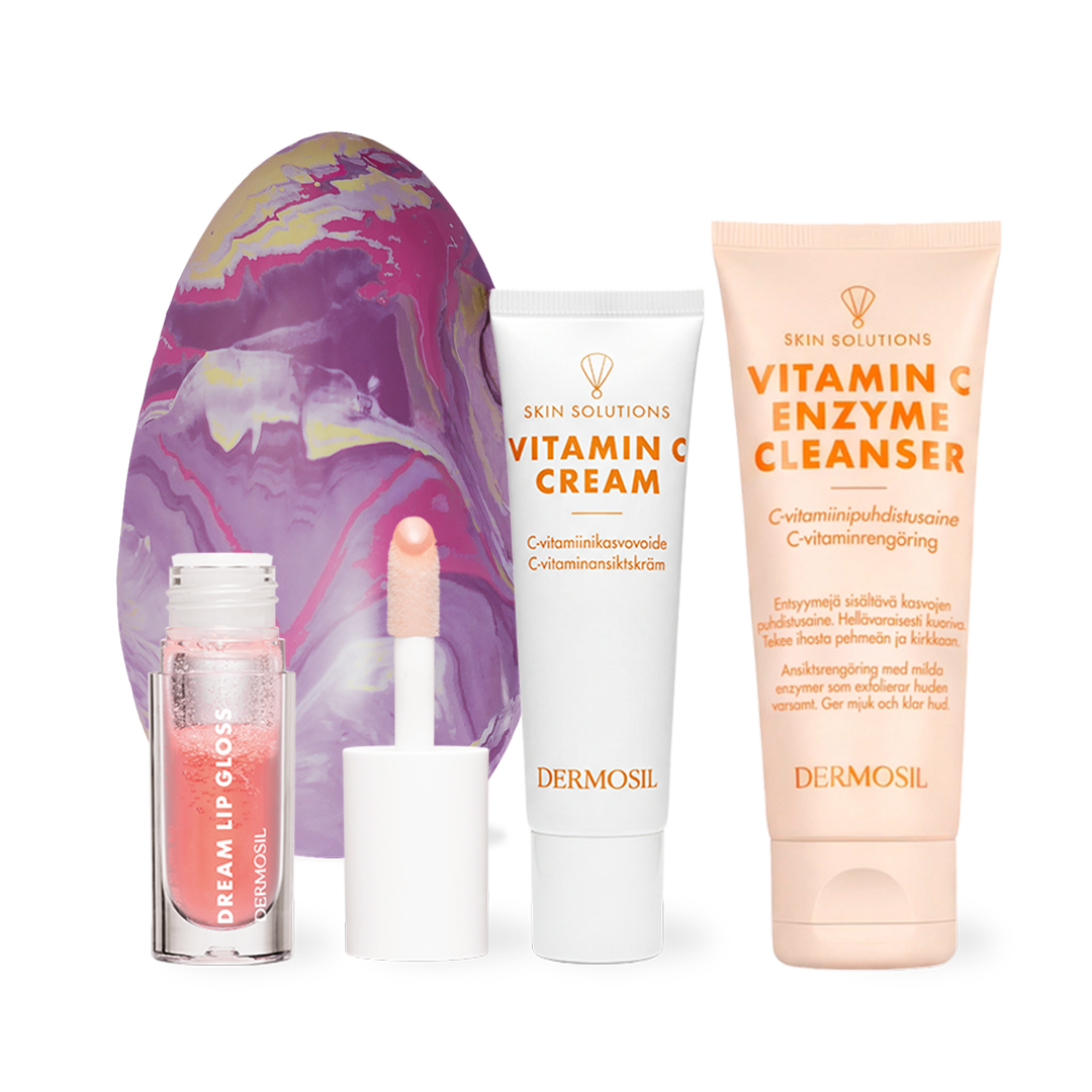 C-vitaminprodukter framhäver hudens naturliga glow! C-vitaminrengöring mini innehåller milda enzymer som skonsamt exfolierar huden och gör den mjuk och klar. C-vitaminansiktskräm mini är en medelfyllig ansiktskräm som vid regelbunden användning främjar hudens lyster. Den hjälper också till att jämna ut hudens struktur och hudton.