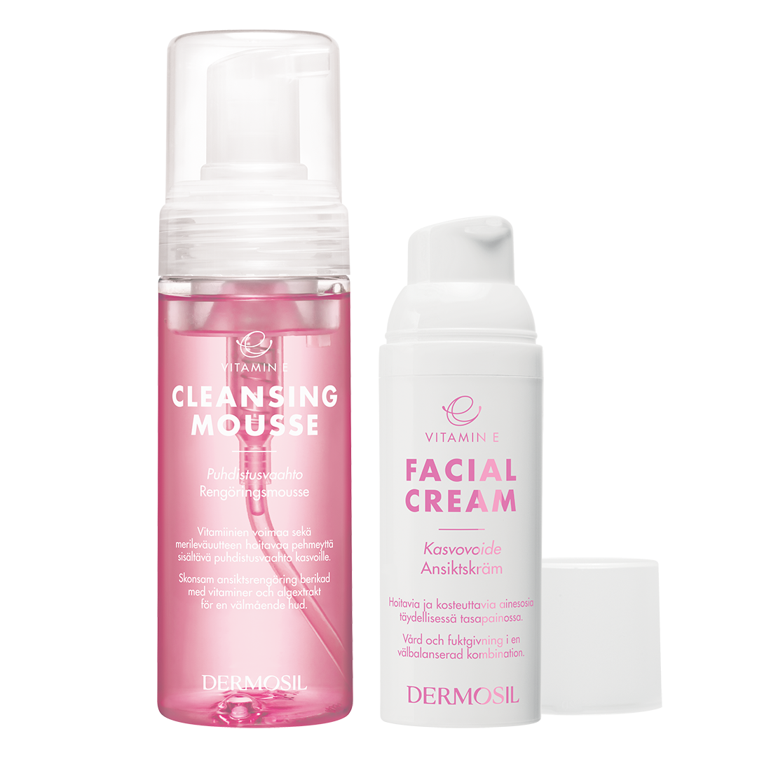 Setet Vitamin E Rengöringsmousse och ansiktskräm innehåller: