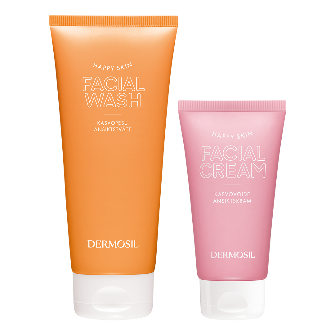 En bra hudvårdsrutin behöver inte vara komplicerad! Happy Skin Ansiktsset innehåller Happy Skin Ansiktstvätt och Happy Skin Ansiktskräm, som tillsammans håller huden ren, återfuktad och välmående. Produkterna har en mild doft av vattenmelon och röda bär.