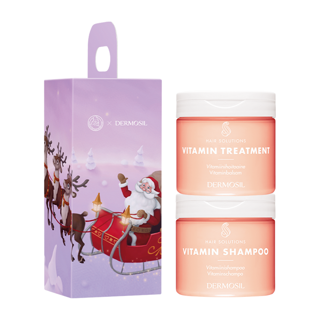 Julgåva Vitaminvård för håret innehåller Vitaminschampo och Vitaminbalsam, fylliga och återfuktande produkter som ger håret en intensivkur.