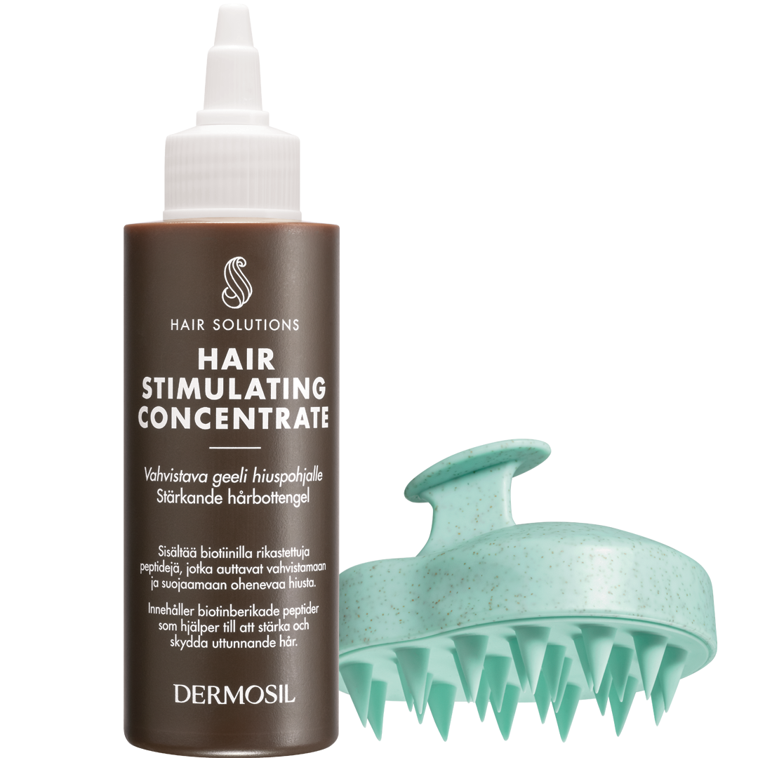 Setet för en välmående hårbotten innehåller en Massageborste för hårbotten och en Stärkande gel för hårbotten. Den lätta gelen hjälper till att stärka och skydda hår som blir tunnare med åldern, samtidigt som den återfuktar hårbotten. Produkten passar både för män och kvinnor. Gelen sköljs inte ur utan absorberas helt av hårbotten utan att lämna en fet eller klibbig känsla.