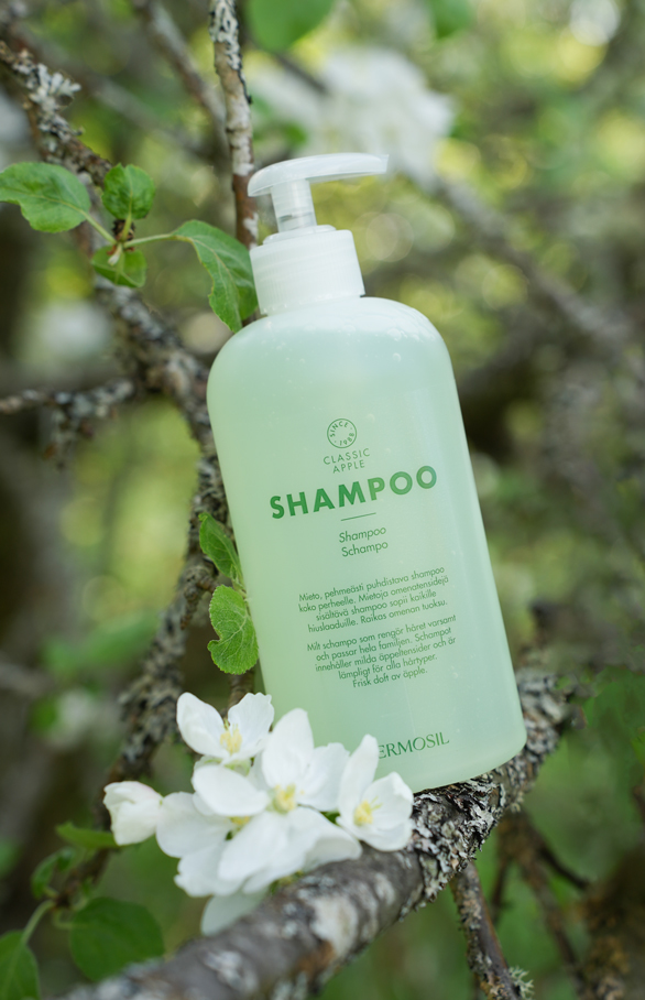Apple Schampo från Classic-serien har en fräsch doft som piggar upp både stora och små. Det milda schampot lämpar sig för alla hårtyper.