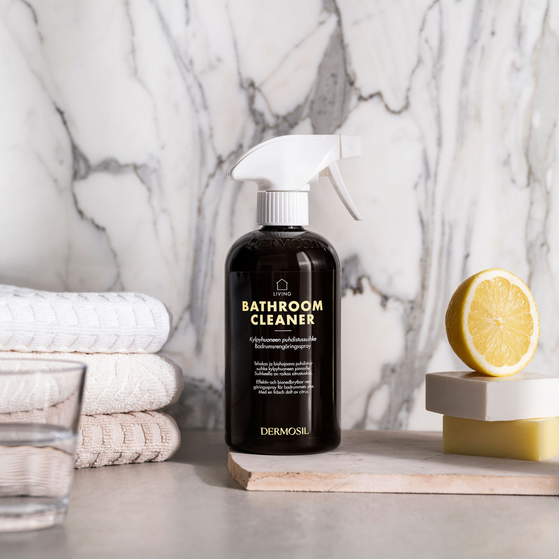 Effektiv rengöringsspray för badrummet. Den användningsklara sprayen avlägsnar effektivt och smidigt alla kalk- och tvålfläckar från badrummets ytor. Den bionedbrytbara sprayen har en fräsch citrusdoft. Vi har förnyat sprayen så att den nu lämnar en fräschare doft efter sig. pH-värde 2–3.