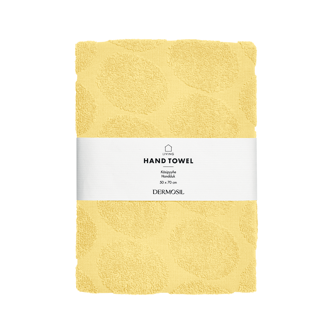 Vacker, gul handduk i 100 % bomull som känns behagligt mjuk mot huden. Denna högkvalitativa handduk ger en vacker touch till ditt badrum och torkar händerna effektivt.