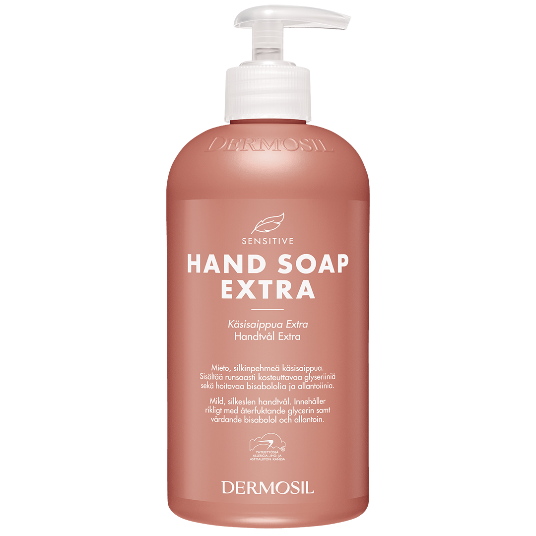 Dermosil Sensitive Handtvål Extra är en mild och oparfymerad tvål för känslig hud som innehåller rikligt med återfuktande och lugnande ämnen. Den pärlemorskimrande tvålen är vit och löddrar mjukt, vilket gör den till en riktigt härlig handtvål för torra händer.
