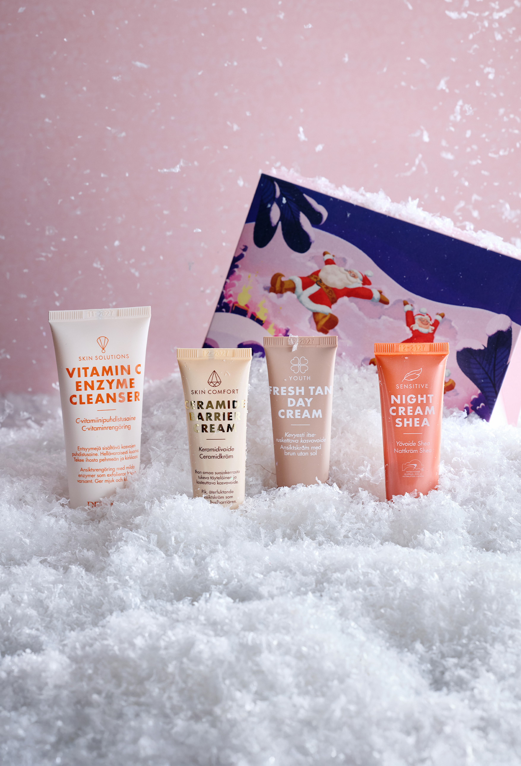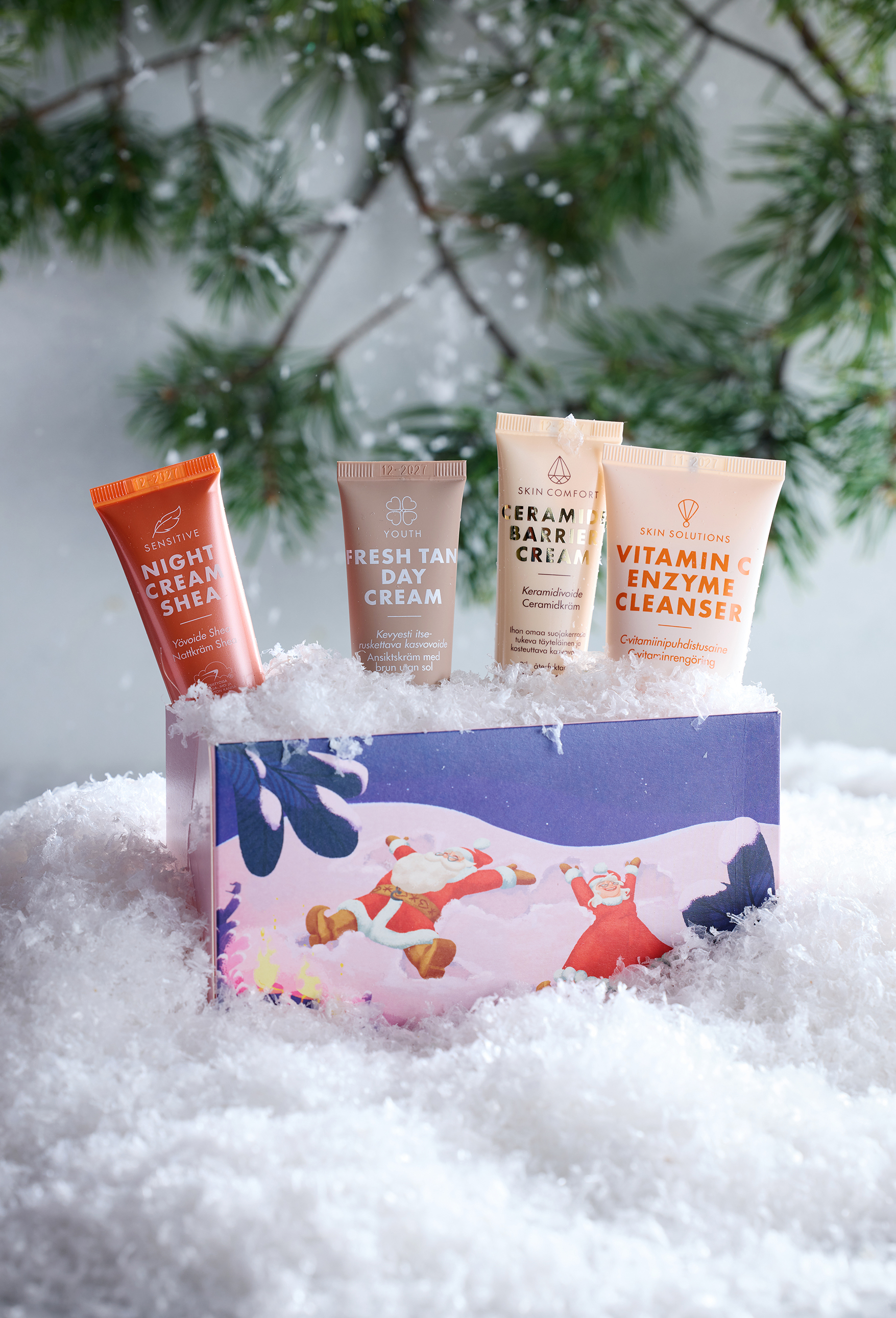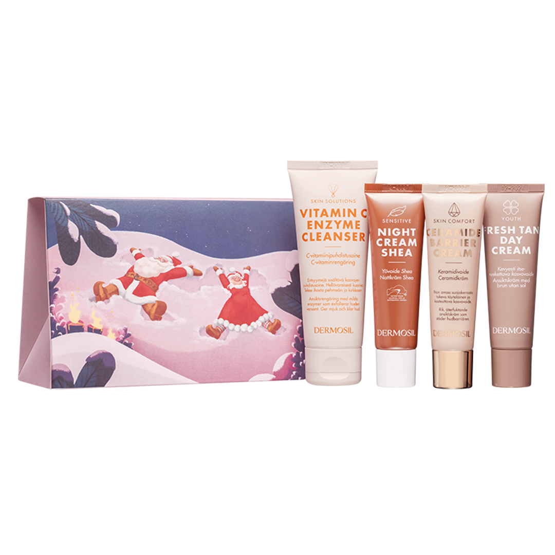 Julförpackningen Happy innehåller fyra älskade hudvårdsfavoriter i mindre format. Produkterna i den här presentförpackningen gör huden glad och lycklig!