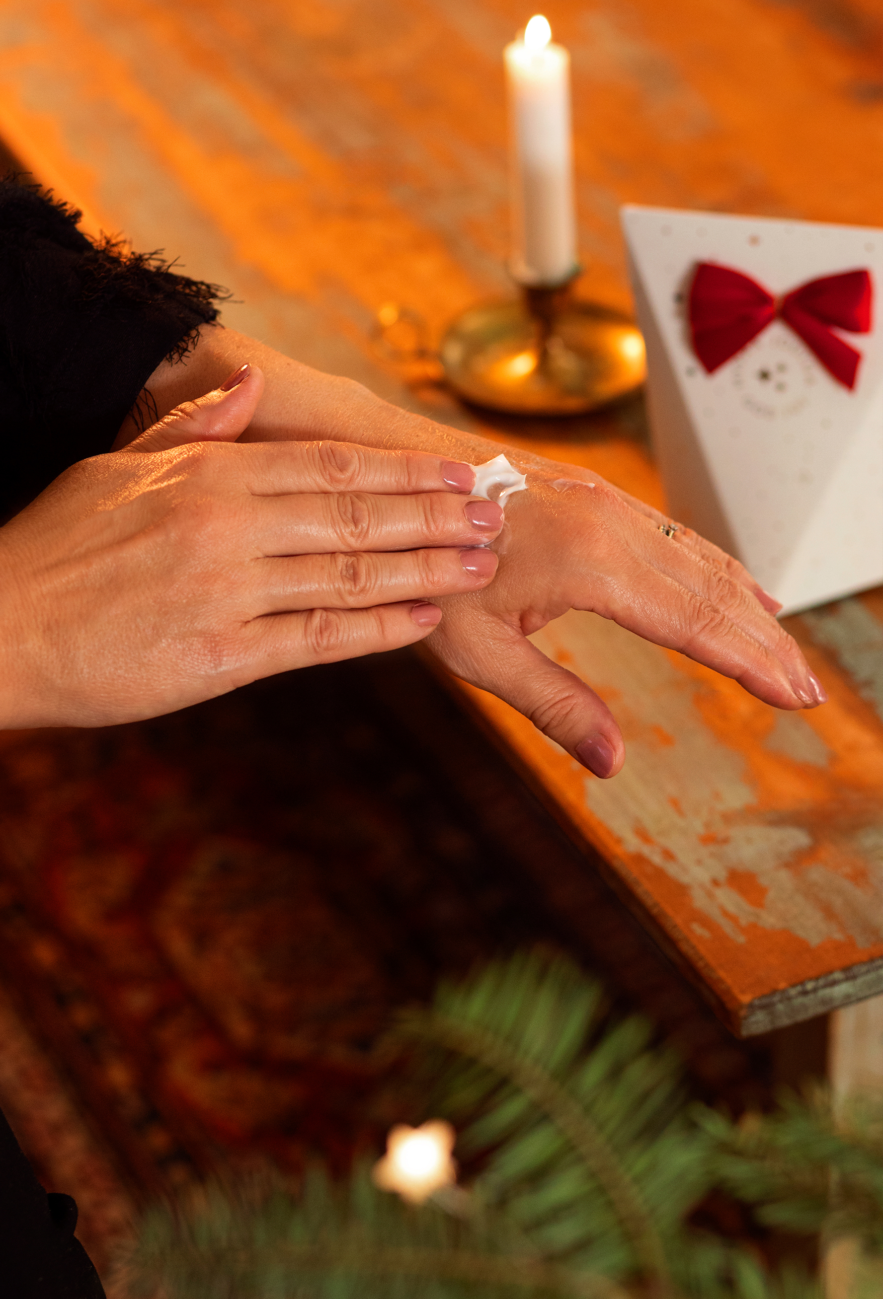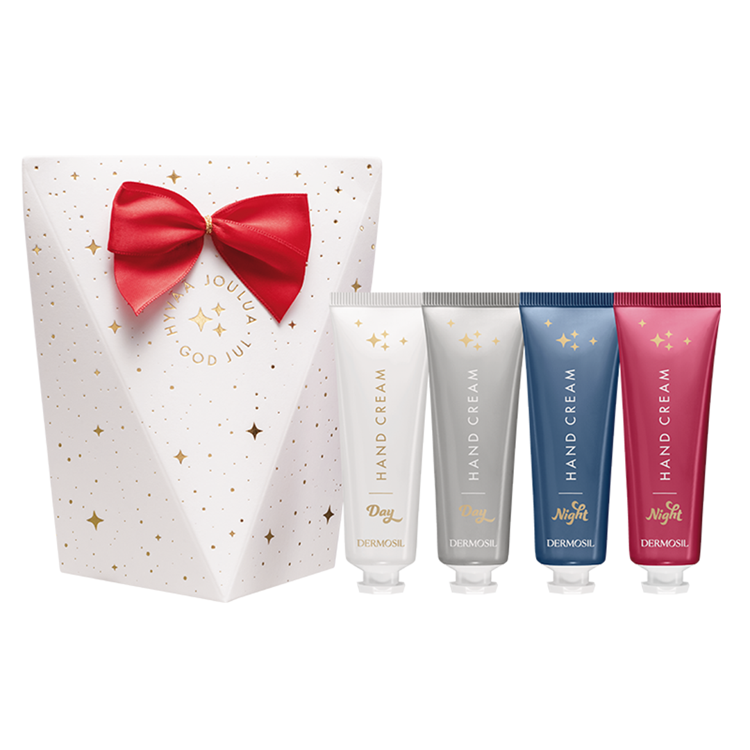 Julförpackningen Friendly gömmer fyra förtjusande handkrämer: två krämer att använda dagtid och två för att vårda händerna över natten.