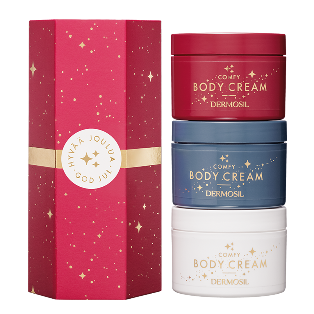Julförpackningen Comfy är ett fantastiskt body lotion-set som består av tre himmelskt mjuka och fullkomligt lyxiga kroppskrämer som vårdar vintertorr hud.