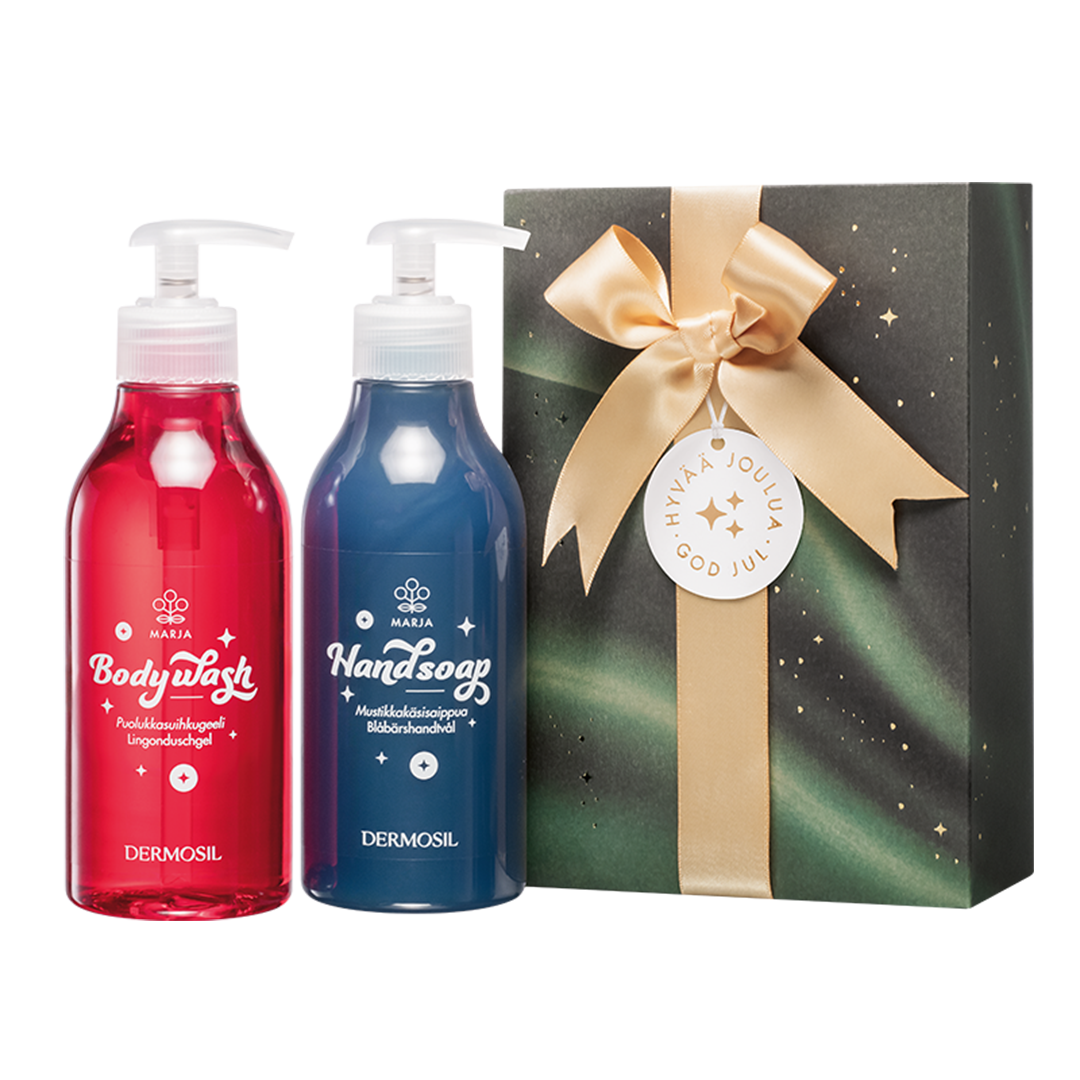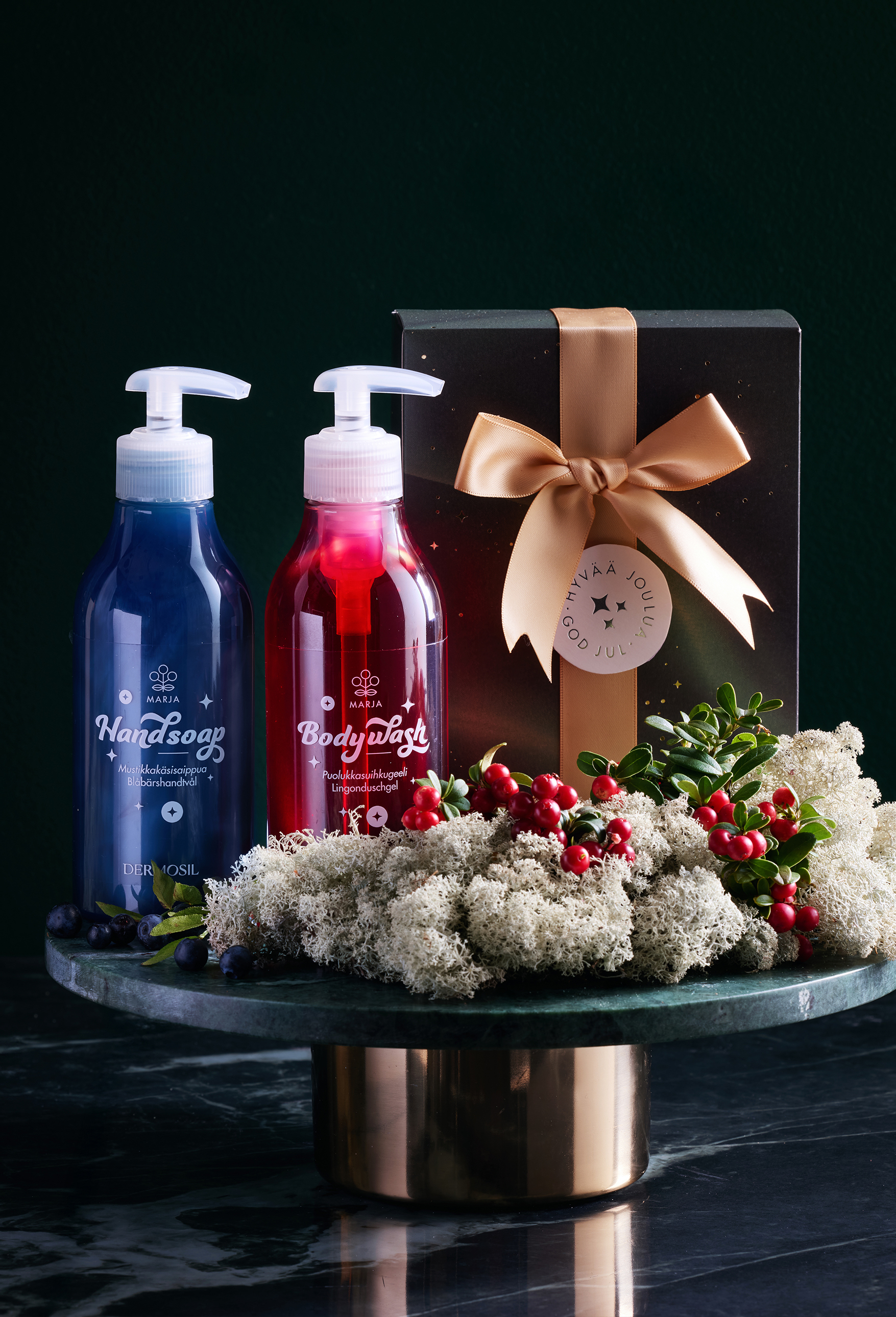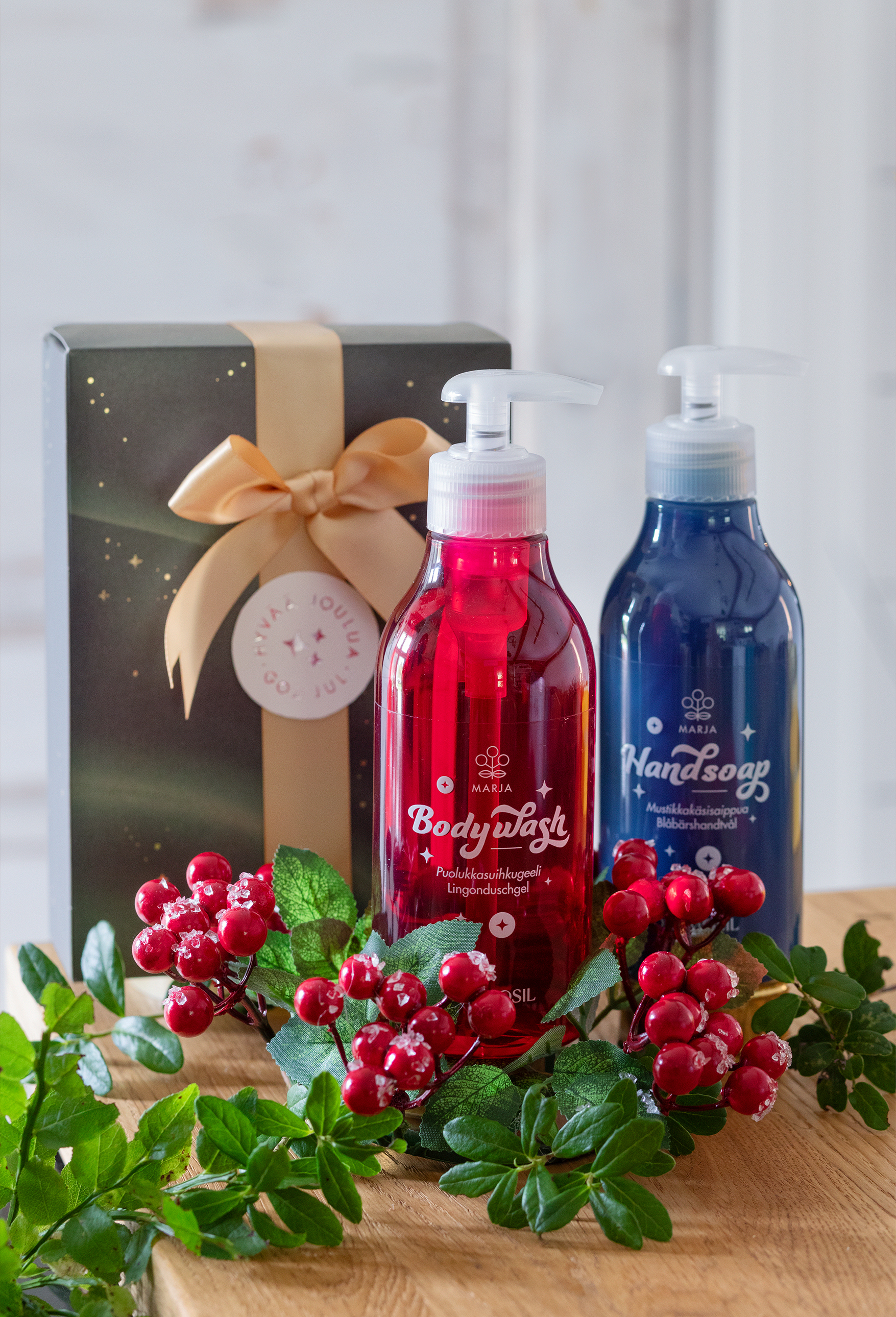 Julsetet Berry innehåller sötsaker från våra finländska skogar, Lingonduschgel och Blåbärshandtvål, i en presentförpackning. De läckra bäriga tvålarna är tillverkade i vår egen fabrik och de har en lyxig sammansättning med äkta blåbärs- och lingonfröolja.