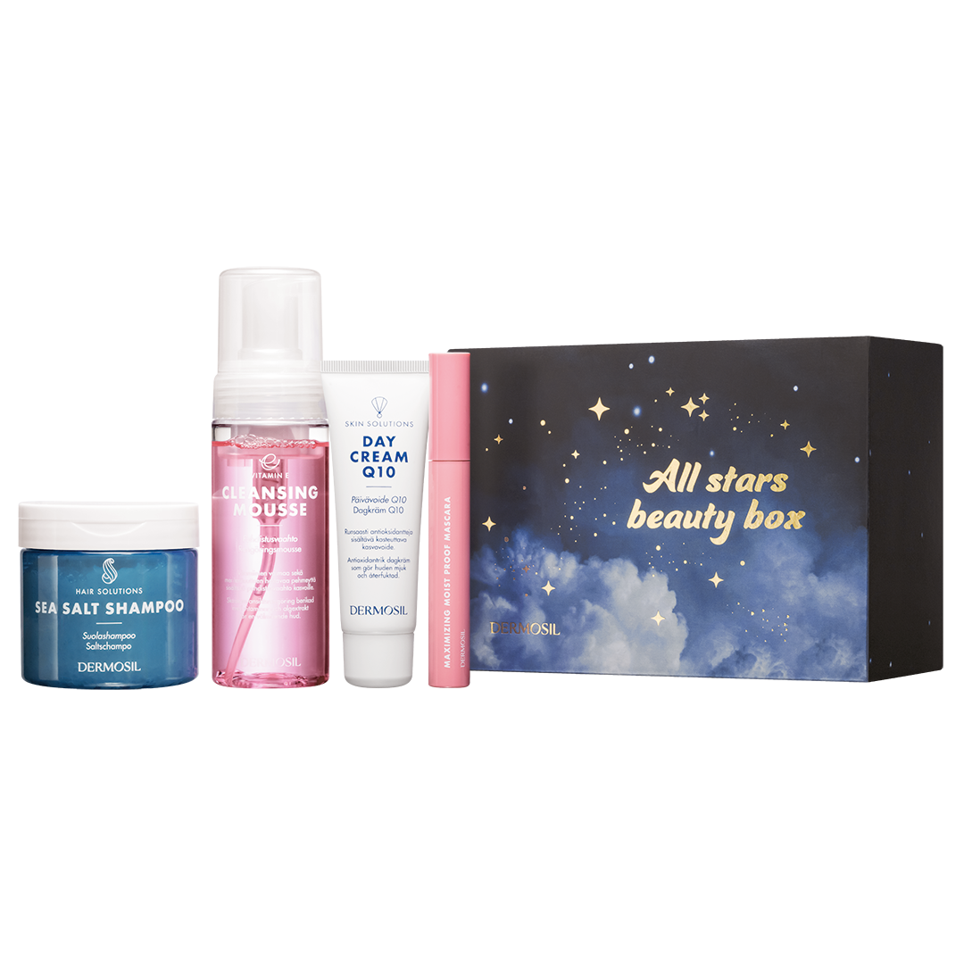 All stars beauty box innehåller fyra av våra mest älskade produkter: Saltschampo, Vitamin E Rengöringsmousse, Maximizing Moist Proof Mascara och Dagkräm Q10.