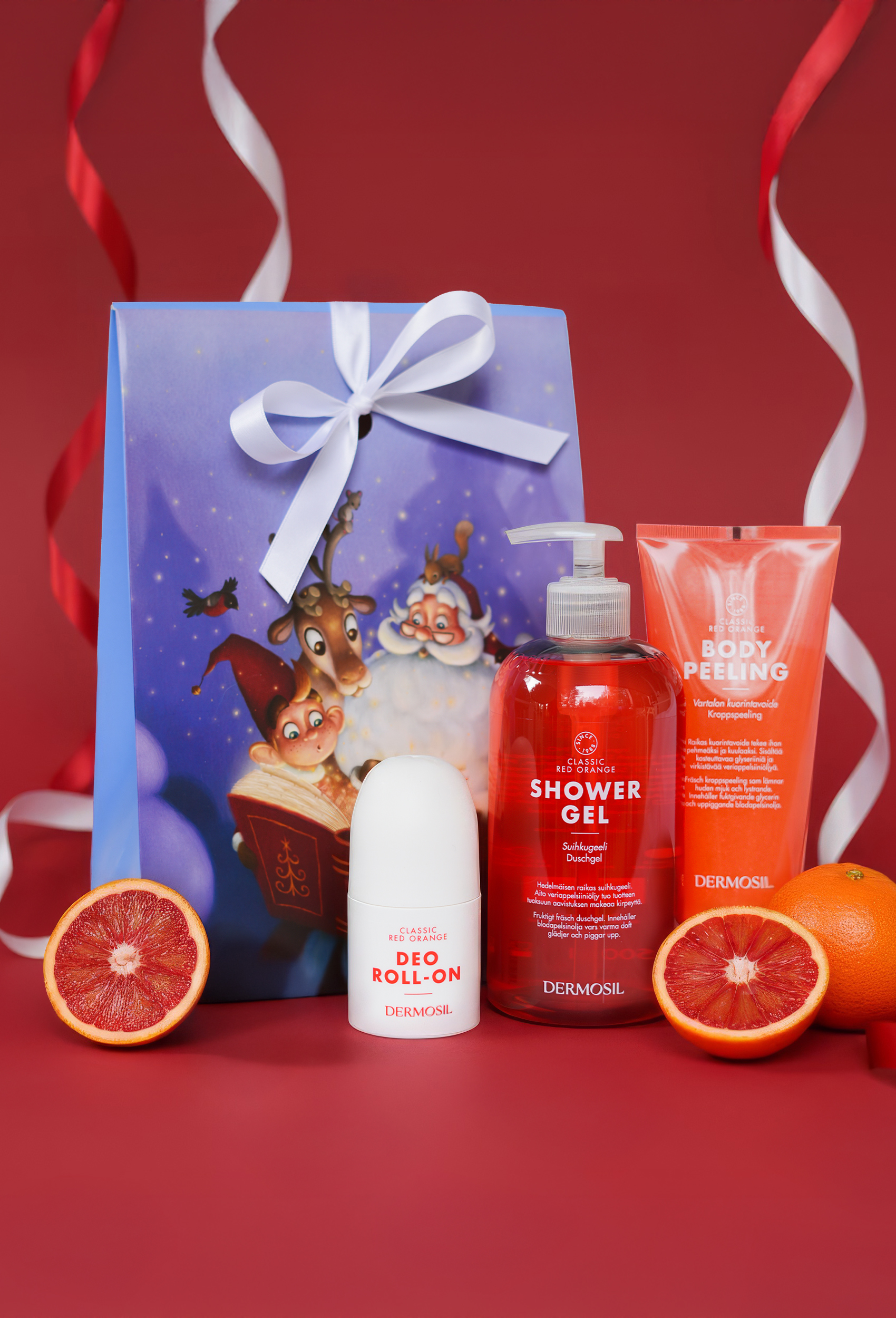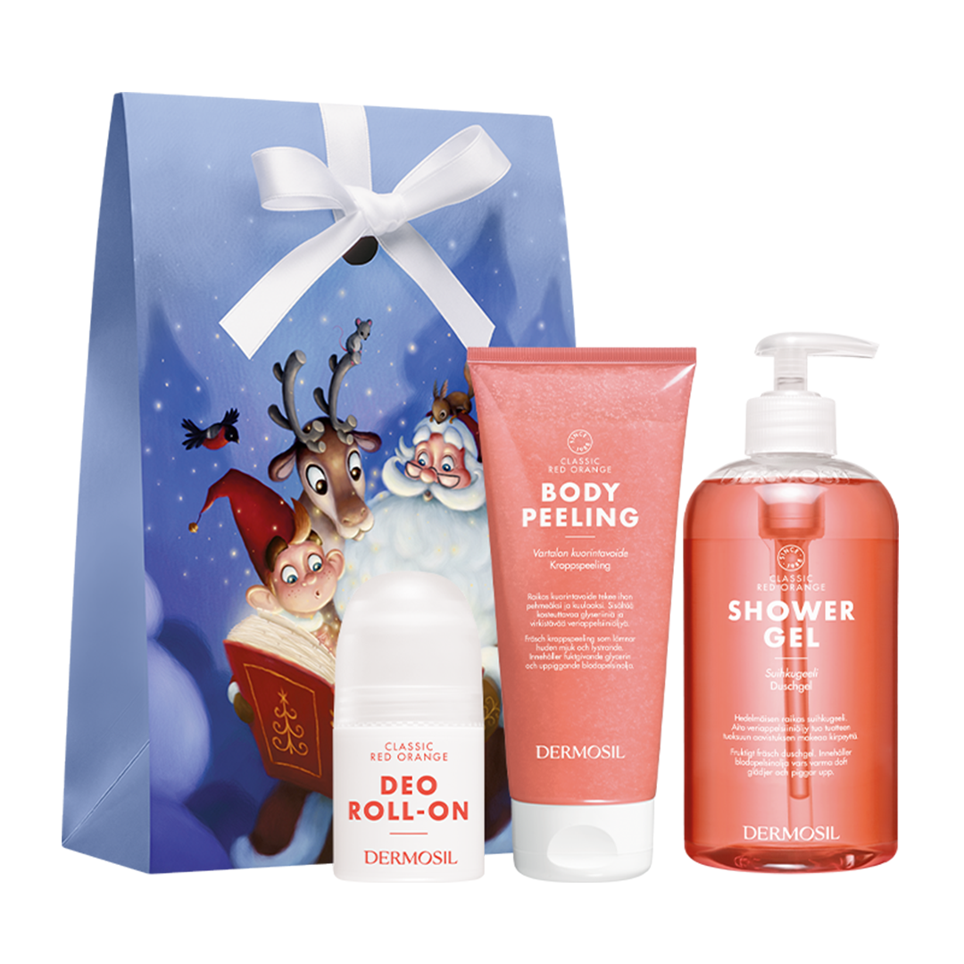 Julgåva Röd apelsin innehåller tre älskade produkter för kroppsvård i serien Röd apelsin: duschgel, kroppspeeling och deodorant. Den sötsyrliga och friska doften av blodapelsin ger en härlig motvikt till vintern.