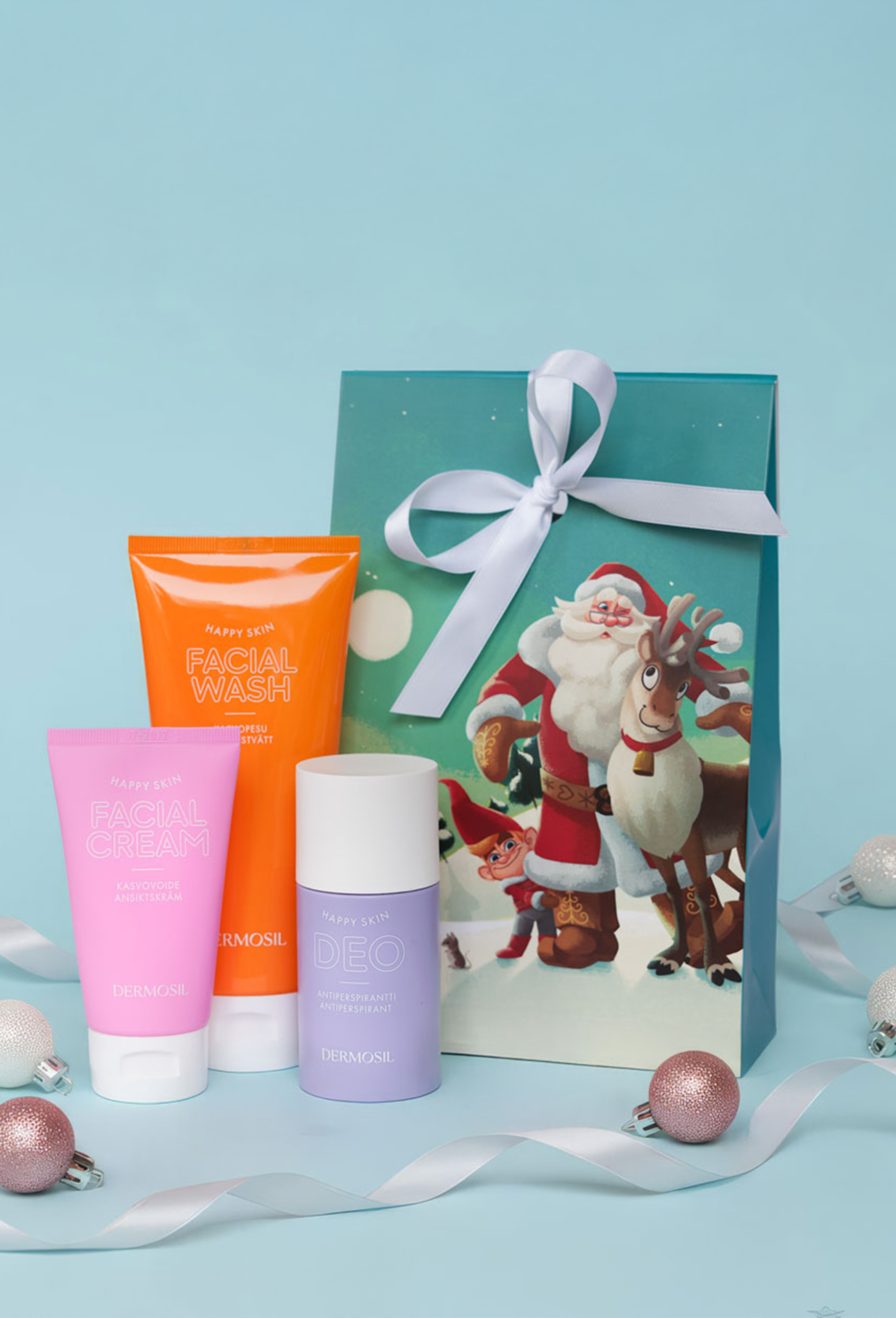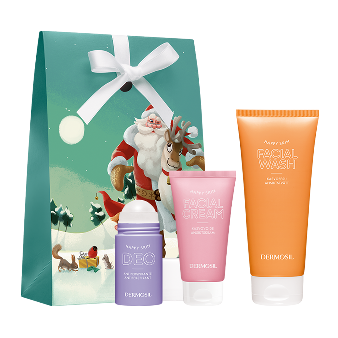 Julgåva Happy Skins produkter gör huden lycklig och hudvården okomplicerad! Förpackningen innehåller tre dryga produkter, Happy Skin-seriens ansiktstvätt, ansiktskräm och deodorant.