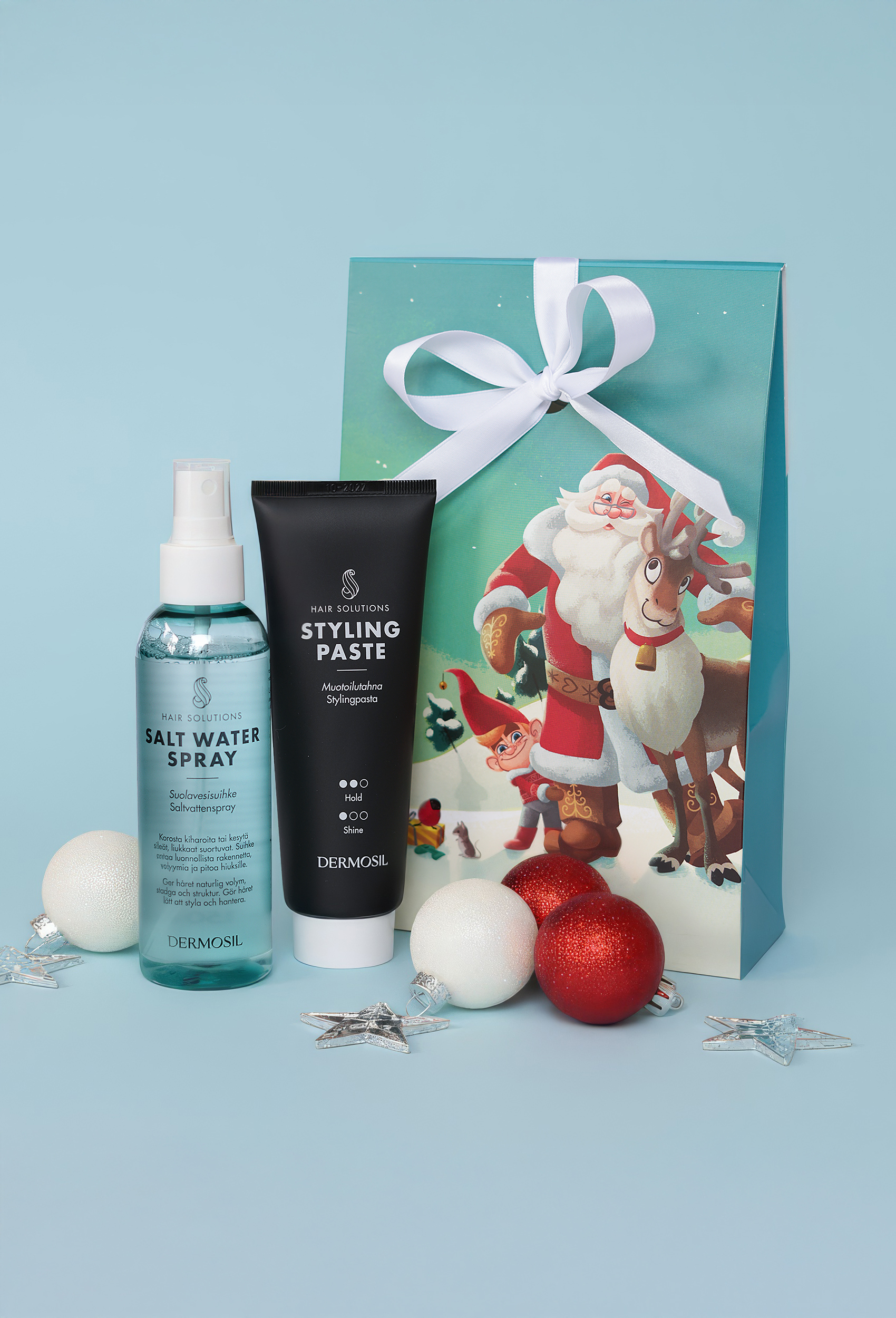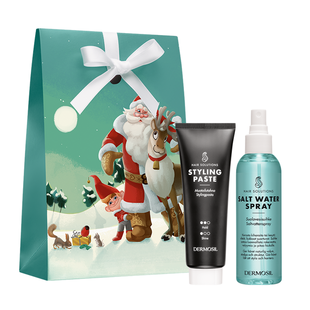 Julgåva Fantastiskt hår innehåller två omtyckta hårstylingprodukter, Stylingpasta och Saltvattenspray, som passar för kort och halvlångt hår. Unisex-produkter för såväl män som kvinnor.