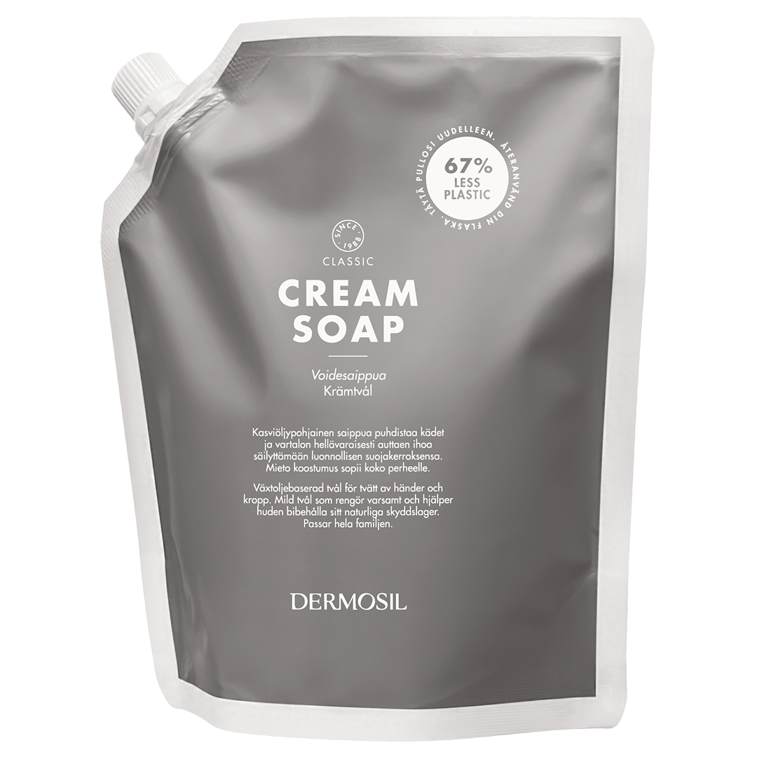 Dermosil Krämtvål är mild med en krämig konsistens. Den är tillverkad av högklassiga vegetabiliska oljor. Används för handtvätt eller som duschtvål för hela kroppen. Tvålen är dryg och passar för hela familjen.