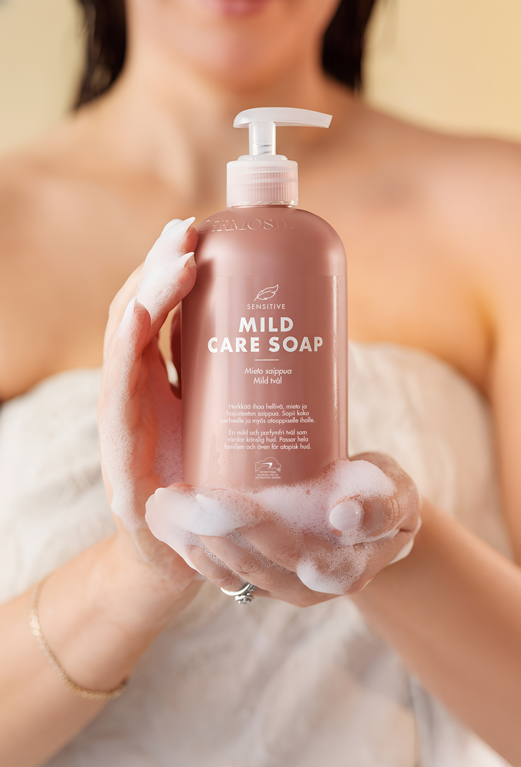 Mild tvål innehåller milda rengörande tensider och därför torkar den inte ut huden lika lätt som en vanlig tvål. Tvålen innehåller också fuktgivande glycerin och betain, vilka hjälper till att bevara hudens fuktbalans. Den extra milda tvålen är avsedd för rengöring av händer och kropp och lämpar sig för hela familjen. Tvålen är trygg att använda också för barn mellan 0–3-år.