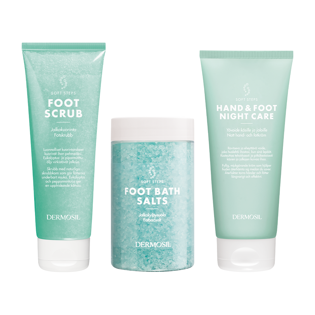 Julgåva Soft Steps innehåller tre av våra mest omtyckta fotvårdsprodukter: Fotbadsalt, Fotskrubb och Nattkräm för händer och fötter. Med dessa produkter kan du enkelt göra en effektiv och avkopplande fotbehandling hemma.