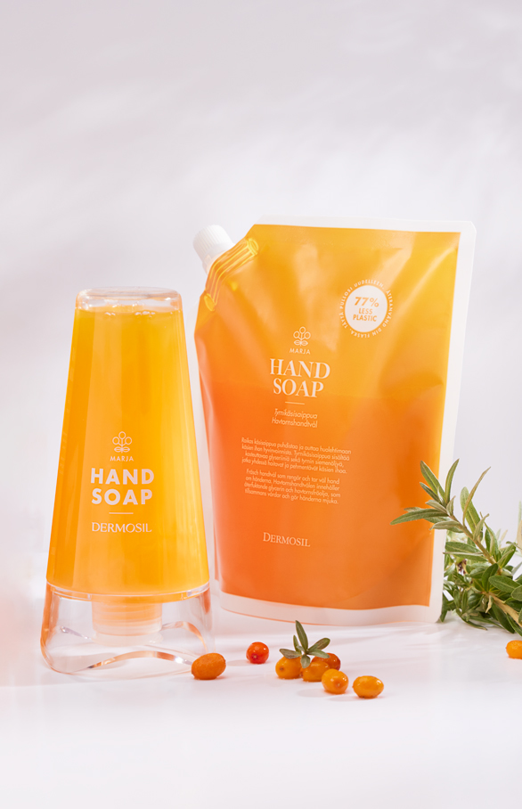 Havtornshandtvål och miljövänliga Havtornshandtvål refill som fräscht, förmånligt set. Njut av de vitaminrika havtornens fördelar i den dagliga handhygienen!