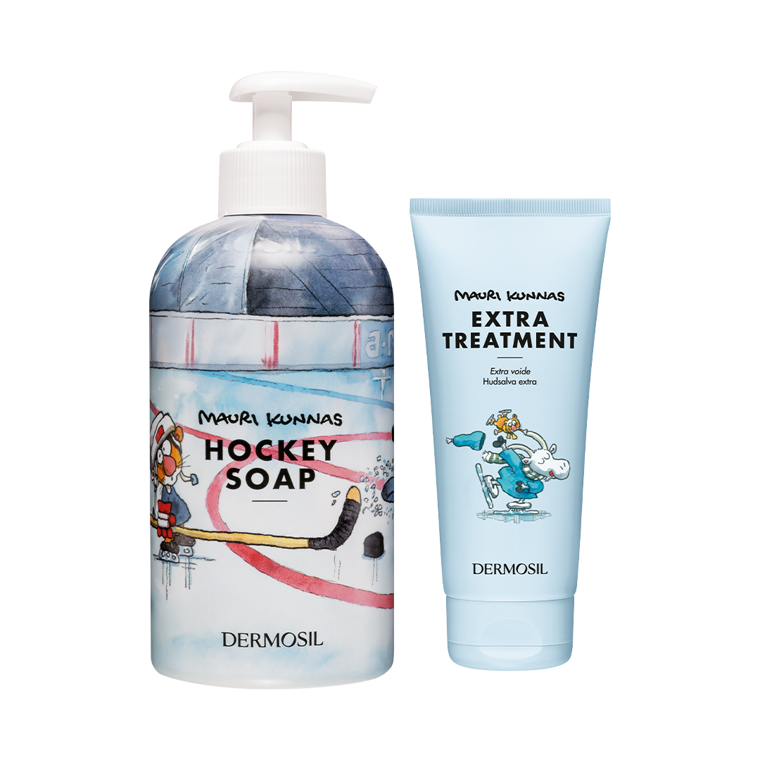 Produkterna i Mauri Kunnas Hockey-setet får huden att kännas bra efter vinteraktiviteter och när vind och kyla påfrestar huden. Setet innehåller Mauri Kunnas Hockey Duschgel och Mauri Kunnas Hudsalva extra.