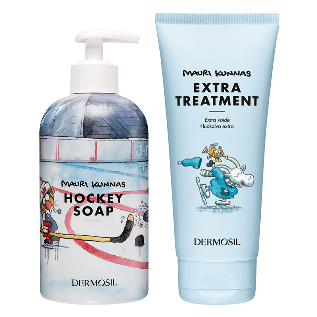 Produkterna i Mauri Kunnas Hockey-setet får huden att kännas bra efter vinteraktiviteter och när vind och kyla påfrestar huden. Setet innehåller Mauri Kunnas Hockey Duschgel och Mauri Kunnas Hudsalva extra.