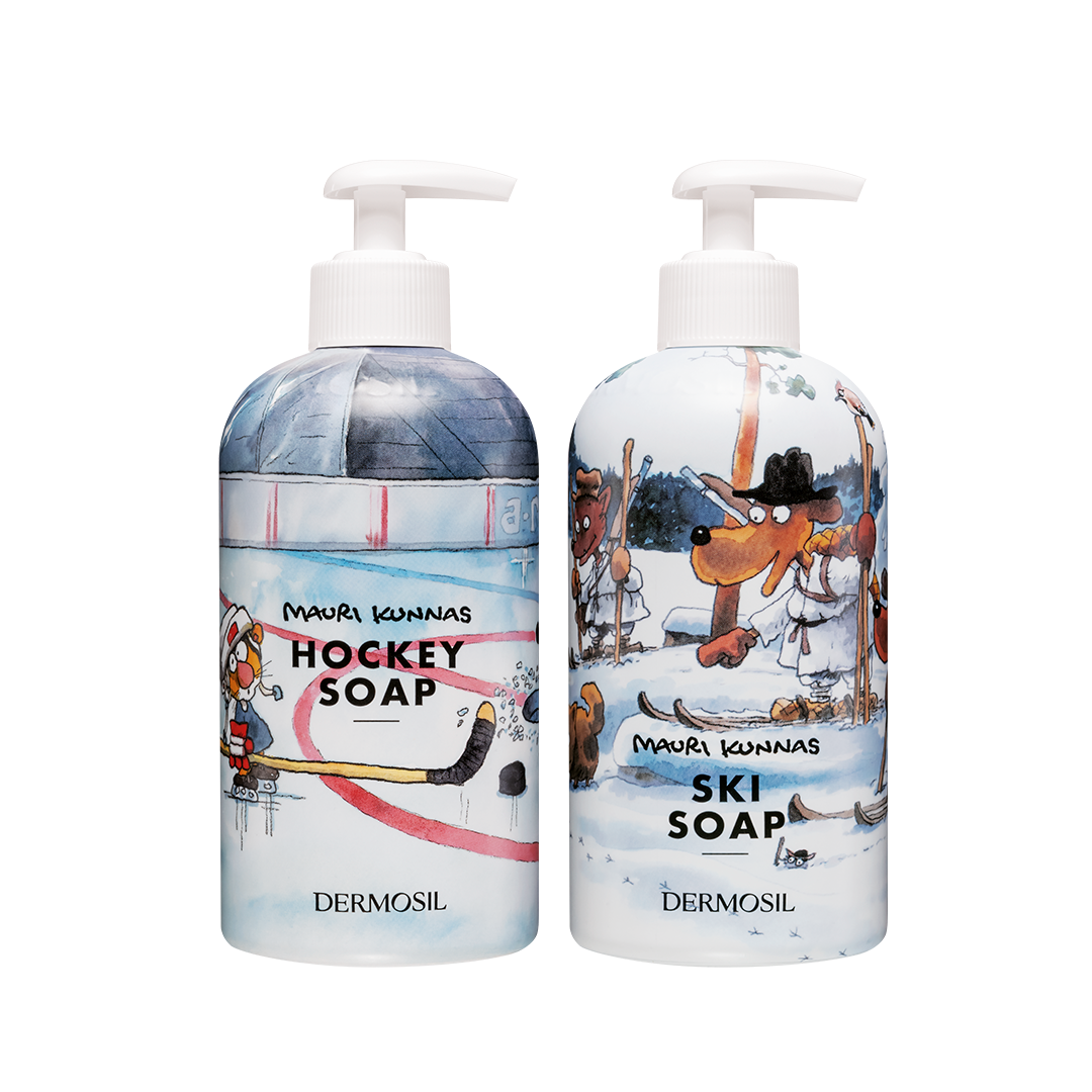 Produkterna i Mauri Kunnas-tvålsetet gör att huden känns fräsch efter ett vintrigt träningspass! Setet innehåller Mauri Kunnas Hockey-duschgel och Mauri Kunnas Ski-handtvål.