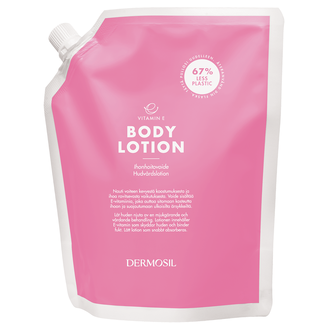 Häll alltid refillpåsens innehåll i en tom, ren och torr flaska. Rengör även pumpen innan du sätter den på plats. Av hygienskäl rekommenderar vi inte att fylla på en halvtom flaska. Dermosils flaskor och pumpar håller åtminstone 3‒4 påfyllningar, så länge du sköter om rengöringen i samband med påfyllningarna.
