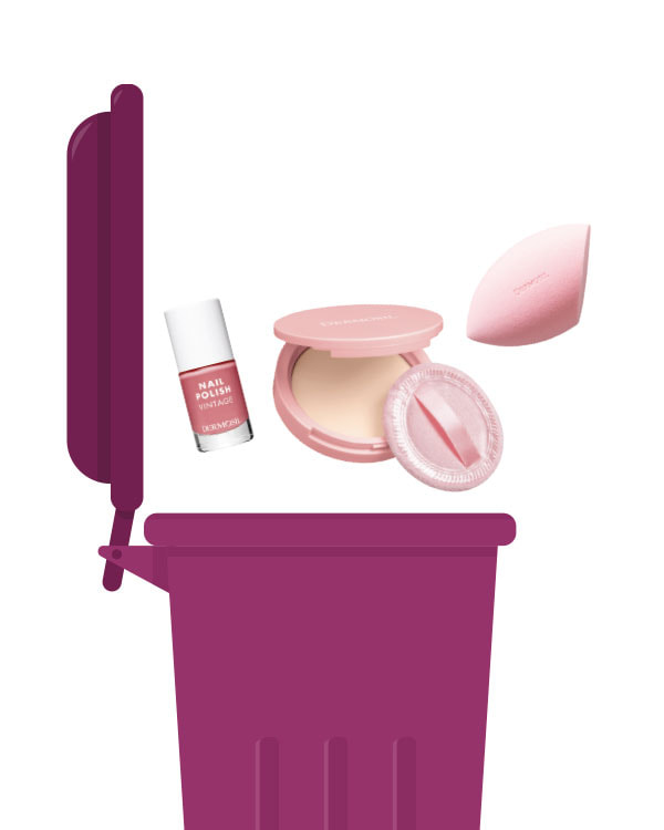 En tom eller helt torkad nagellacksflaska är blandavfall. Nagellack i flytande format innehåller däremot lösningsmedel och är därför farligt avfall. Gamla makeupsvampar ska sorteras som blandavfall, och om sminkförpackningen i plast innehåller en magnet eller spegel, hör hela förpackningen till blandavfall. Även delvis oanvänd kosmetika hör till blandavfall.