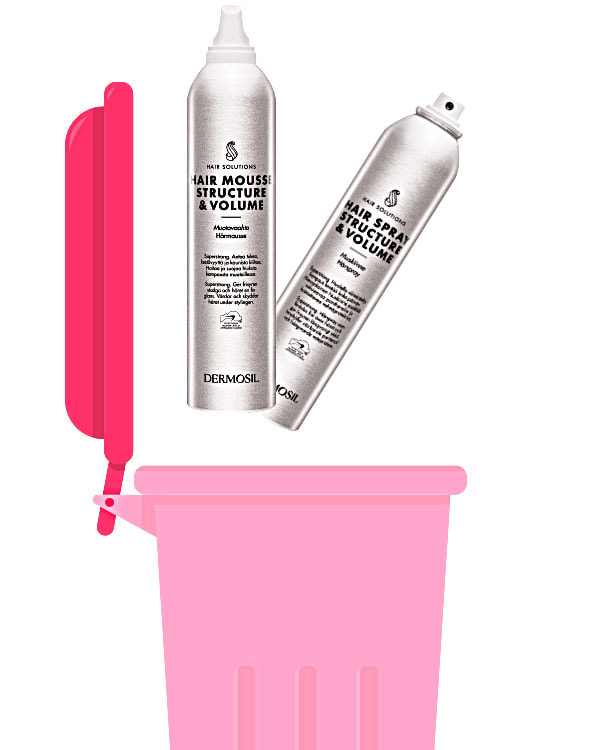 Du kan lägga tomma aerosolflaskor, såsom hårspray- och hårmousseflaskor, i metallinsamlingen. En tom flaska låter inte när den omskakas och pyser inte när man trycker. Ifall flaskan inte är helt tom räknas den som farligt avfall. Sortera den lösa plastkorken i plastinsamlingen.