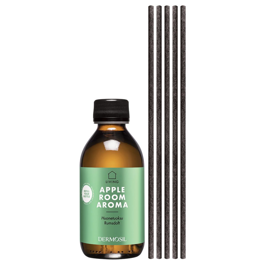 Med Apple Rumsdoft refill kan du fylla på din rumsdoft igen. Denna 200 ml stora refillflaska räcker till två påfyllningar. Förpackningen innehåller även fem nya doftstickor.