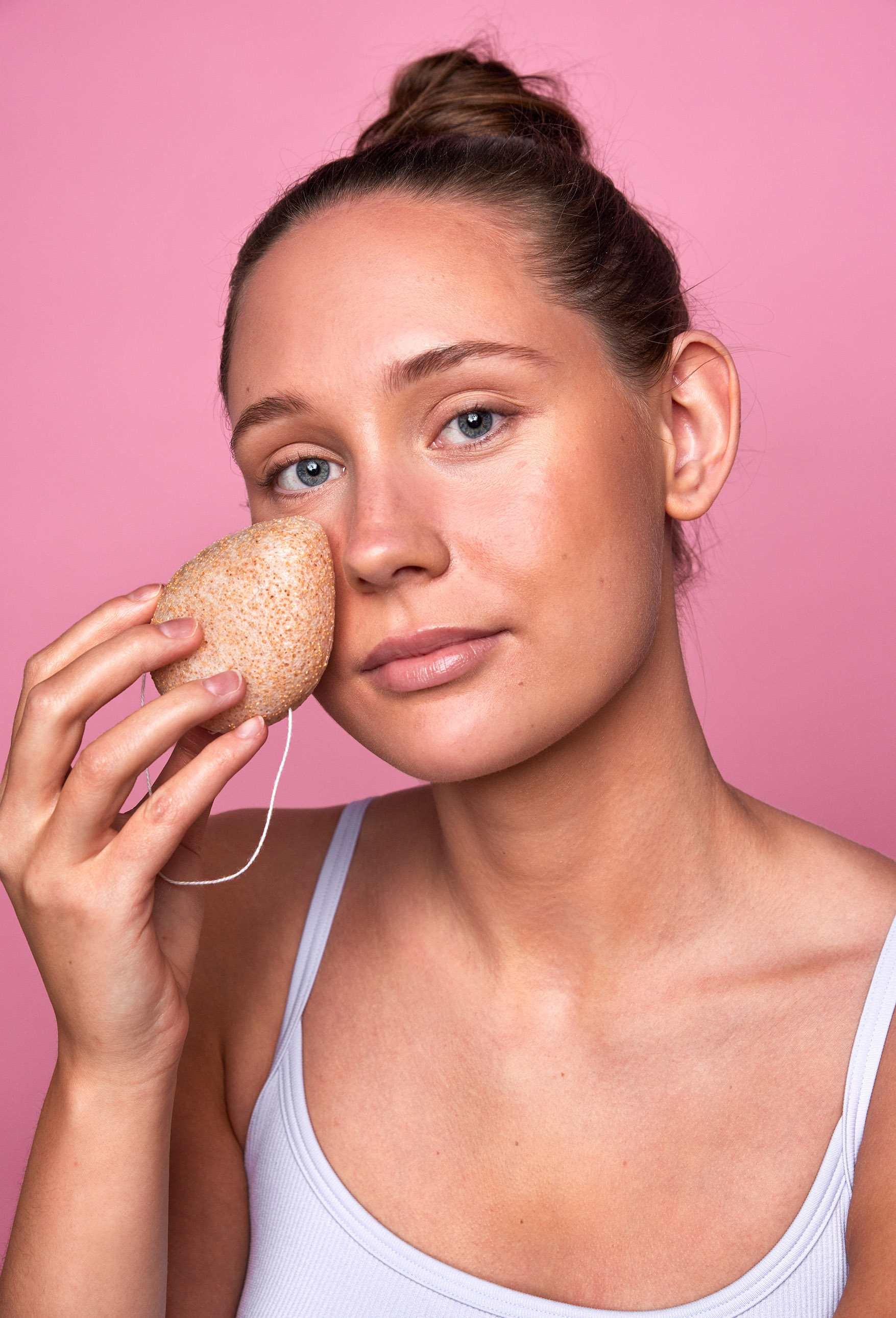Naturliga och skonsamma Konjac 2-in-1 rengöringssvamp lämpar sig för rengöring och peeling av alla hudtyper. Vid användning av Konjac-svampen rengörs porerna på djupet och blodcirkulationen i ansiktet stimuleras. Svampen har två sidor: den ena sidan peelar huden effektivt med hjälp av valnötskorn och den andra sidan rengör huden varsamt. Du kan använda den andra sidan av svampen dagligen som sådan eller tillsammans med en rengöringsprodukt och den peelande sidan 1–2 gånger i veckan. Du kan också peela läpparna varsamt med svampen.