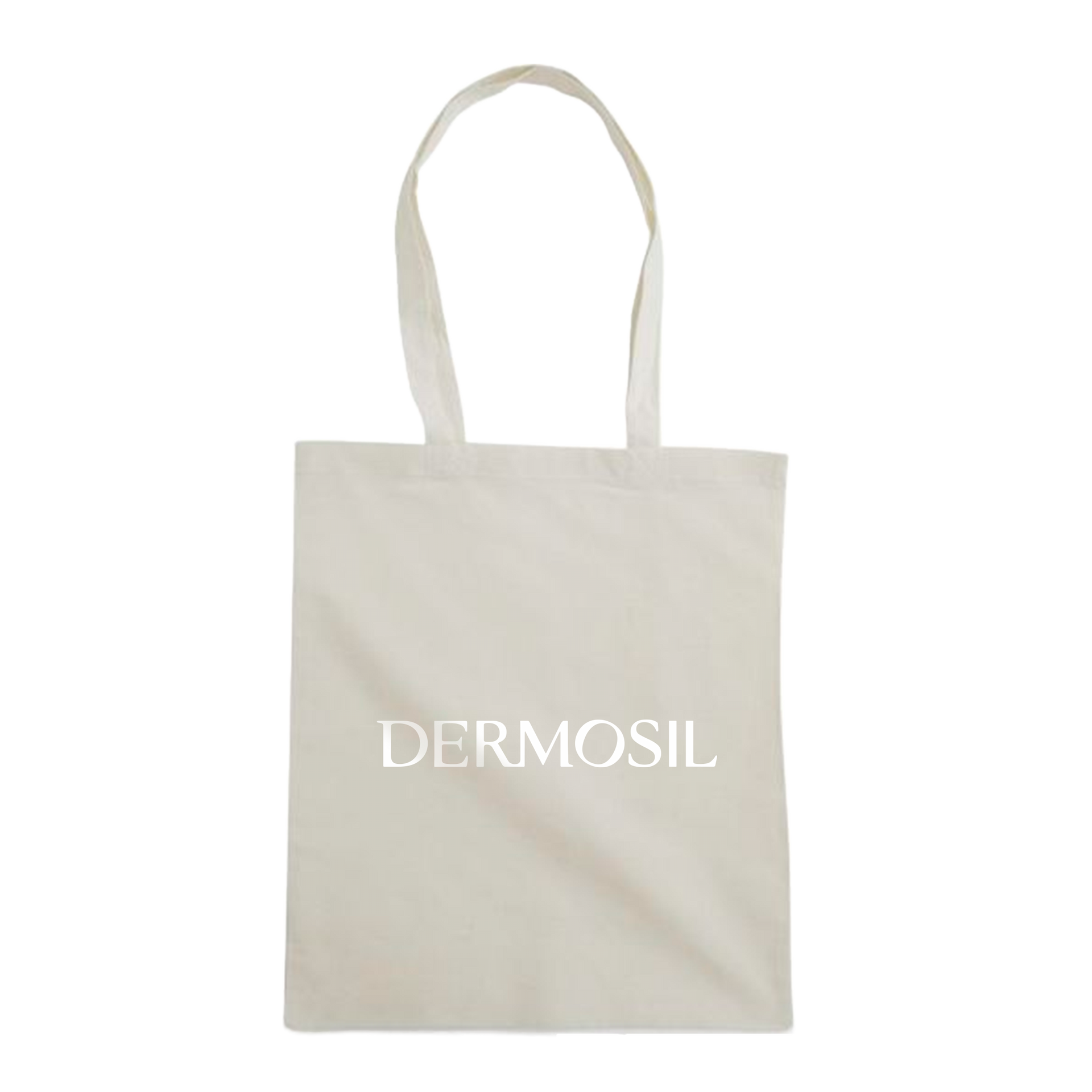 Den ljusa Dermosil tygkassen är tillverkad av stadigt bomullstyg. Kassens storlek är 41 x 38 cm och den har långa bärremmar så att den kan slängas bekvämt över axeln.