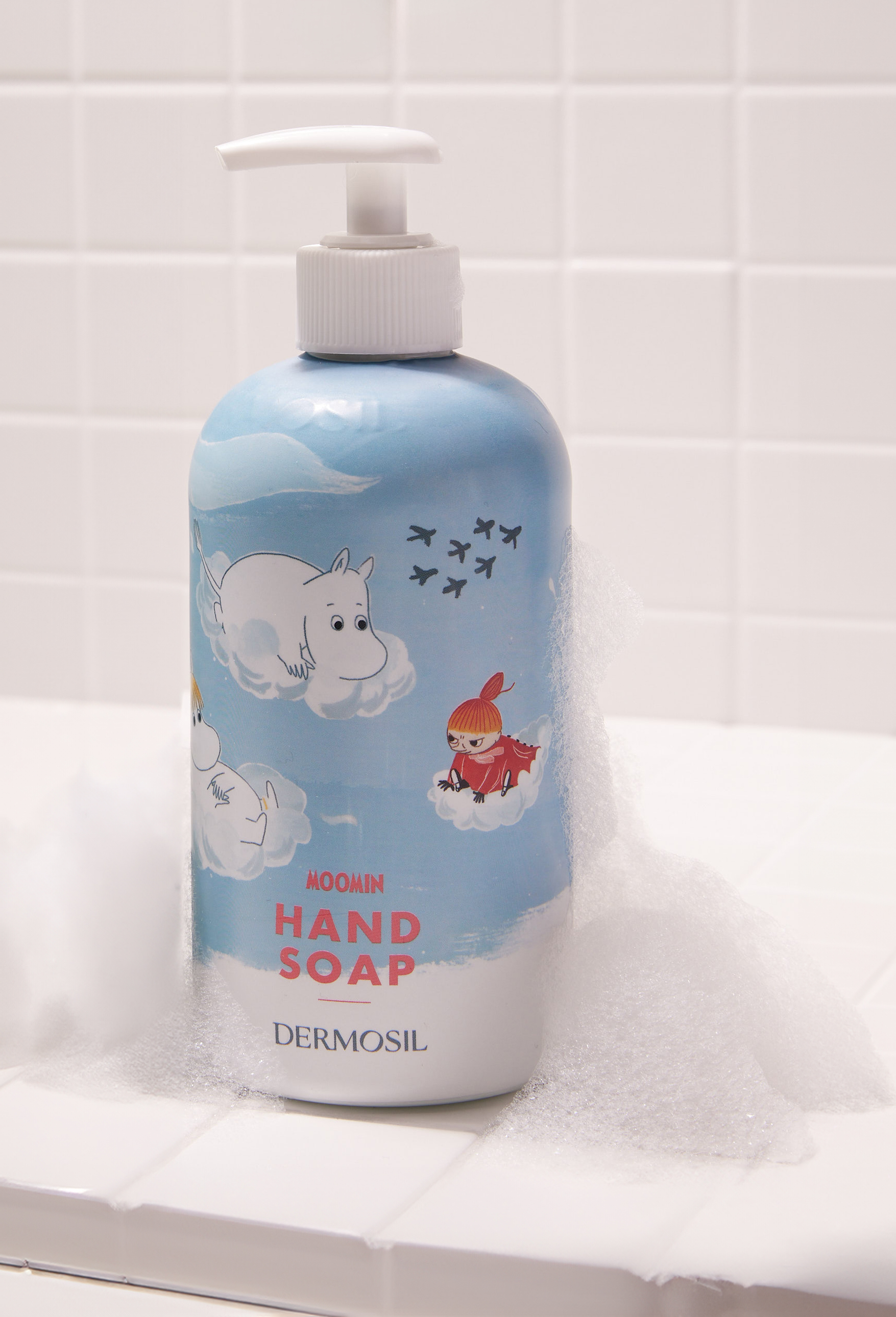 Den söta handtvålen pryds av en bild från berättelsen om Trollkarlens hatt. Mumintrollen hittar trollkarlens hatt och använder den som soptunna. Äggskalen som kastats i hatten förvandlas till moln, vilka vännerna hoppar upp på och flyger i väg med.