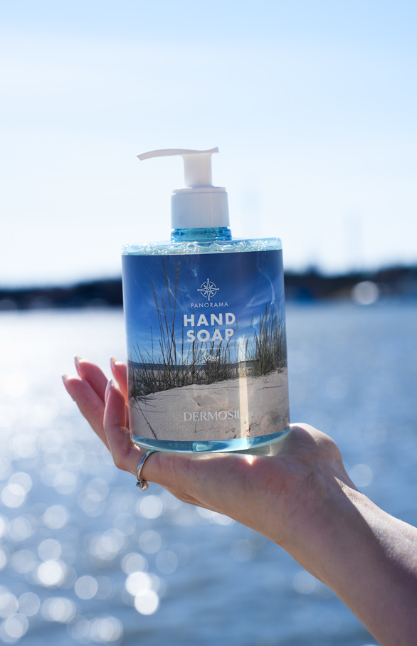 Panorama West handtvål bjuder in dig till den finska västkusten för att njuta av den salta havsbrisen och av den mjuka sandstranden. Flaskan pryds av ett foto från en somrig strand i Yyteri, Björneborg. Tvålen tvättar varsamt händerna rena och förtjusar med sin livliga och fruktiga doft, som innehåller doftnyanser från nordiska bär såsom hjortron, hallon, samt svarta och röda vinbär.