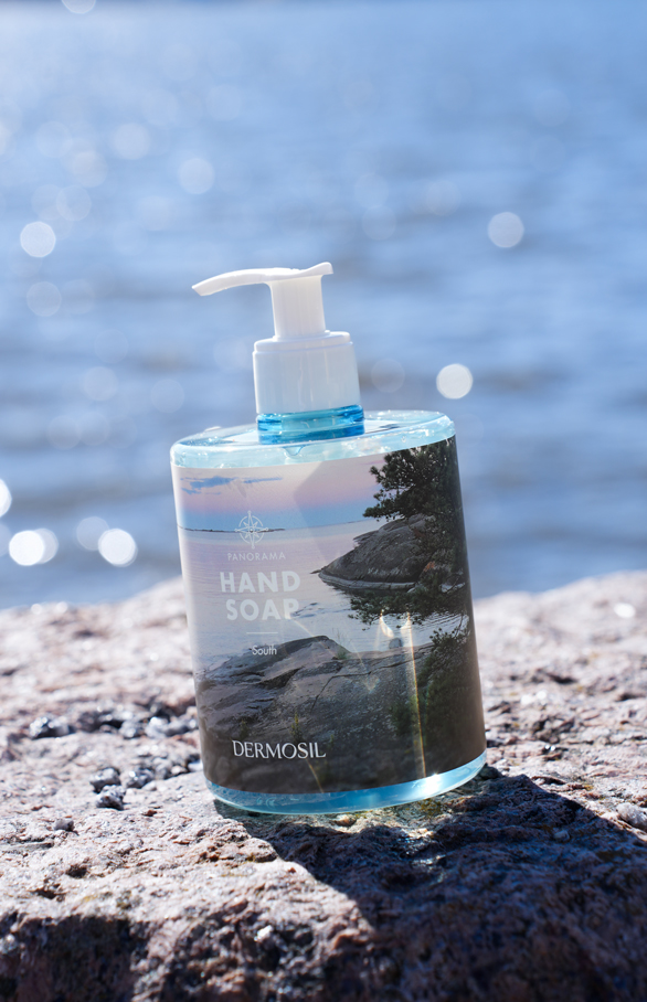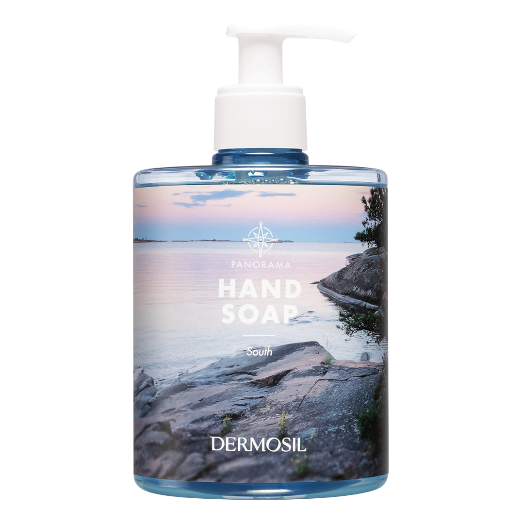 Panorama South handtvål tar dig med till Finlands sydligaste delar, till Hangös marina landskap. Tvålen illustreras med en bild från Hangös glittrande hav och de majestätiska klipporna en sommarkväll då solen håller på att gå ner i havet. Handtvålen har en somrig och fruktig doft där du i doftbasen noterar rabarber, päron, persika och bär.