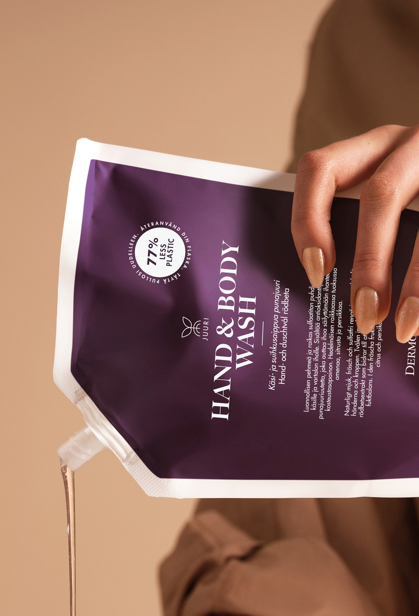 Juuri-seriens Hand- och duschtvål rödbeta och den miljövänliga Hand- och duschtvål rödbeta, refill – nu som ett fullständigt set. Njut av den fräscha och naturliga Hand- och duschtvål rödbeta betydligt längre!