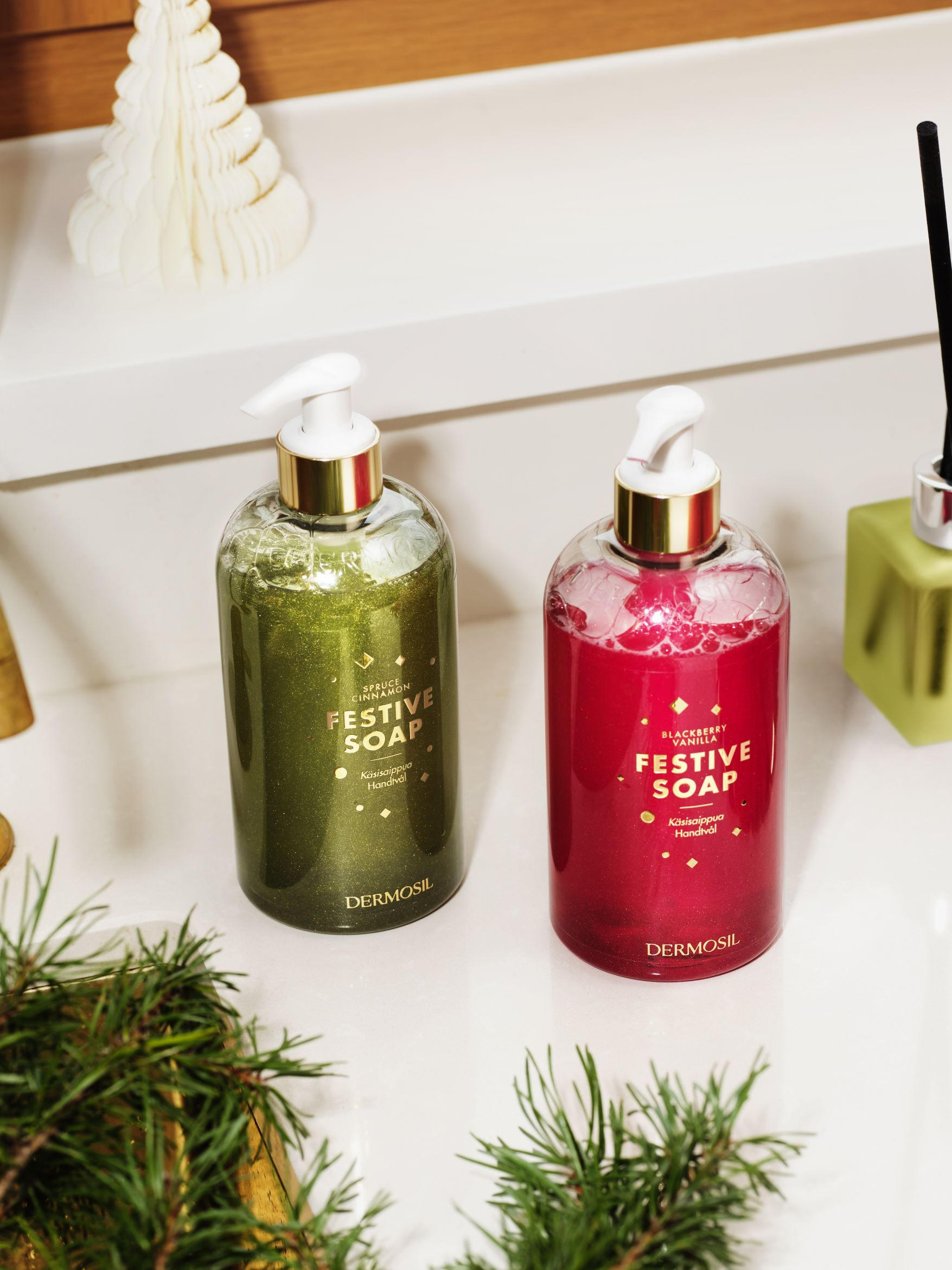 Festive handtvål Blackberry Vanilla har en spännande kombination av lingon och björnbär med en nypa vanilj. Festive handtvål Spruce Cinnamon har en varmt kryddig doft av kanel kombinerat med fräscha inslag av citrusfrukter och gran. De skonsamma men effektiva tvålarna är tillverkade i Korsnäs, Österbotten, och de innehåller vårdande glycerin. Tvålarna är veganska.