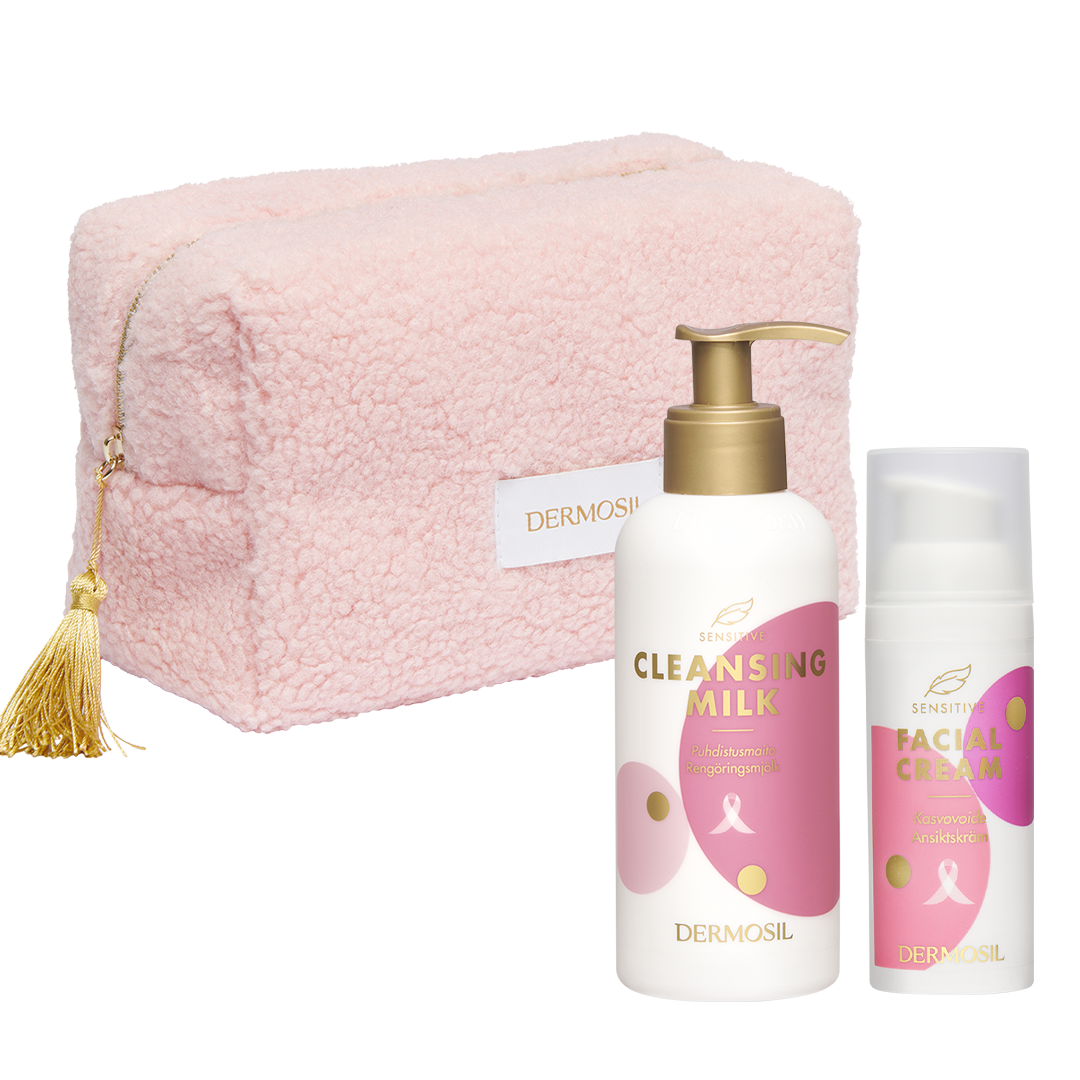 Rosa bandet gåvosetet innehåller Rosa bandet-kollektionens Sensitive Ansiktskräm, Sensitive Rengöringsmjölk samt en Toalettväska. Gläd dina nära och kära denna jul med detta härliga produktset!