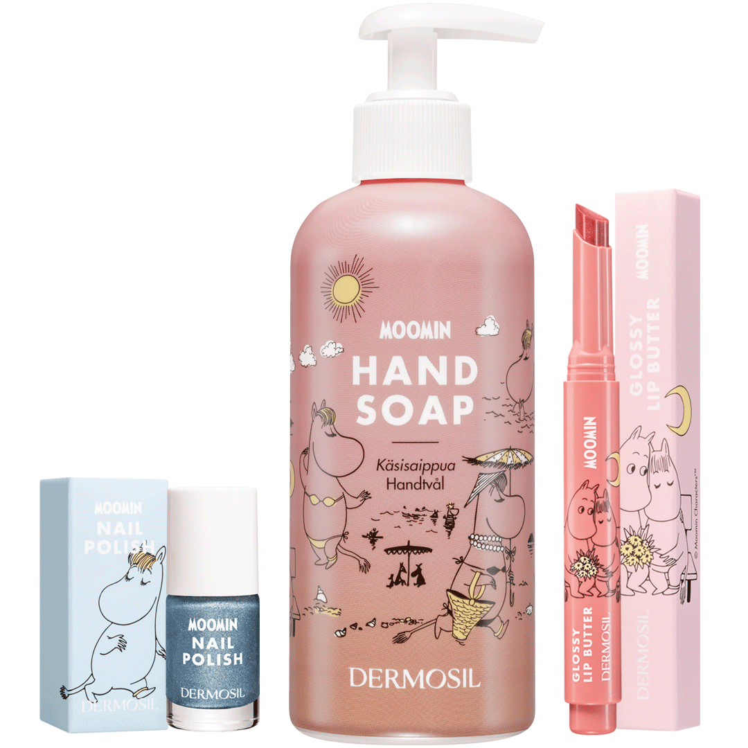 Söt trio med Snorkfröken-illustration: handtvål, nagellack och läppbalm. Perfekt som present eller för egen sommarlyx.